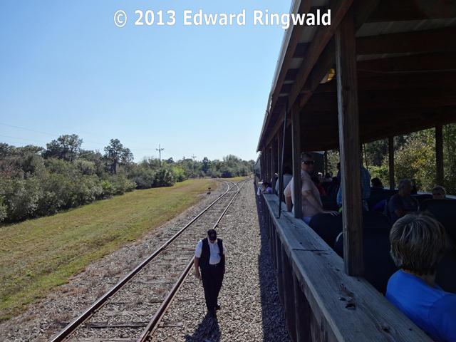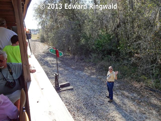 When the train stops you will see a second track on your right. It is the locomotive runaround track and it is on that track that the locomotive will use to reverse direction to get ready for the southbound journey back to Parrish later on. In fact, if you go to the open air observation car you can watch the train crew in action as the locomotive is disconnected from the train, pulled northward past the switch and the crew lines the switch so that the locomotive can go around the passenger cars and be the first going south.